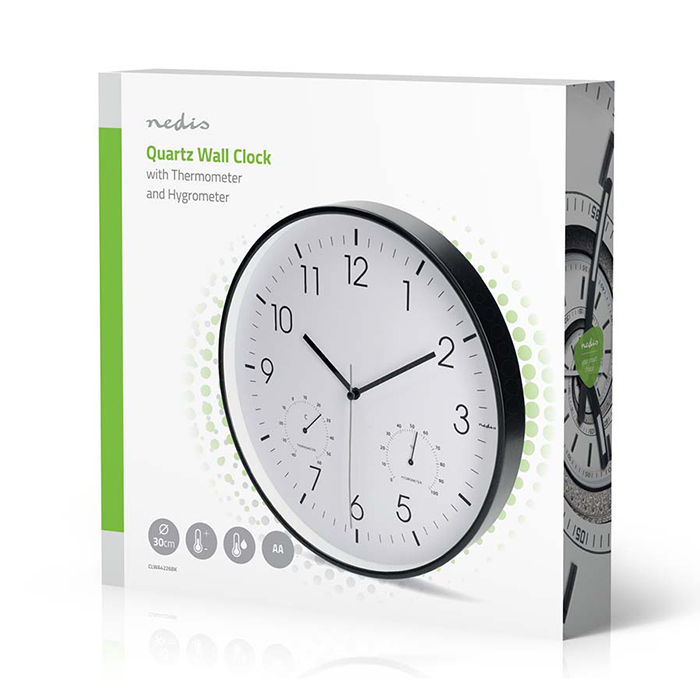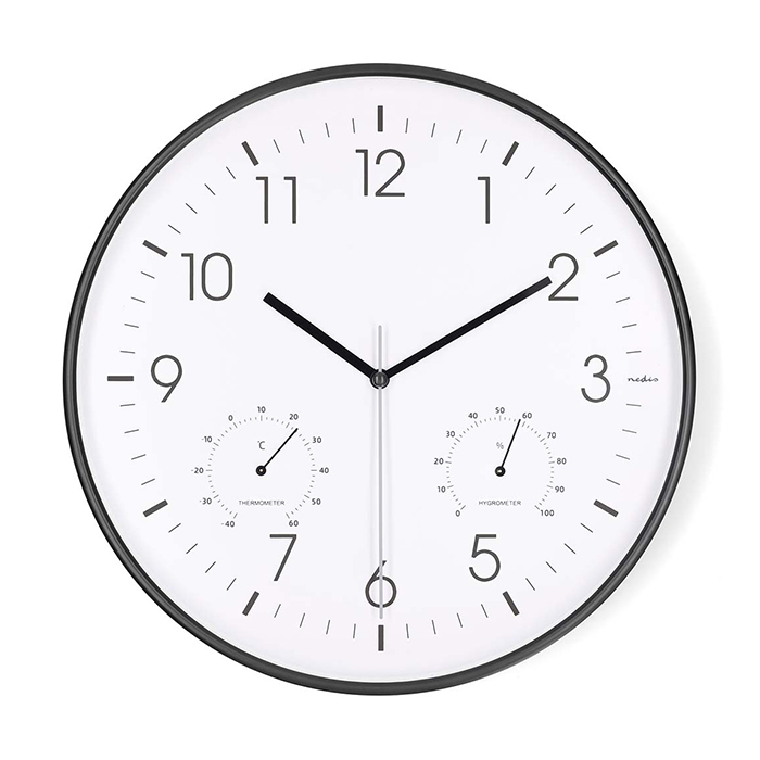 NEDIS CLWA4226BK Ρολόι τοίχου, αθόρυβο, με ενσωματωμένο θερμόμετρο και υγρόμετρο, σε λευκό/μαύρο χρώμα.