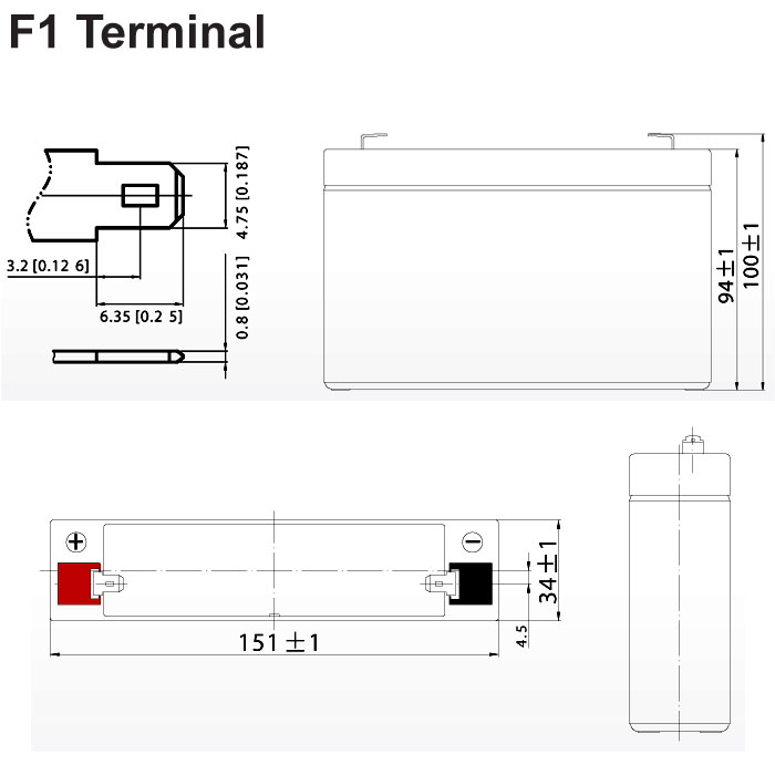 Μπαταρία μολύβδου 6V 7Ah Διαστάσεις: – μήκος: 15.1 cm – πλάτος: 3,4 cm – ύψος: 9,4 cm – Τύπος Terminal: F1