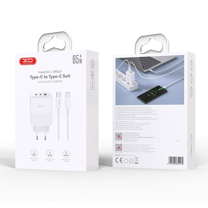 XO L139 (EU) 65W GAN NITRIDE (1USB-A 45W + 2 USB-C 65W) FAST CHARGING CHARGER WITH TYPE-C CABLE (NB1